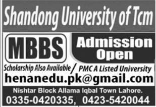 Shandong University of TCM Admission 2022 for the program of MBBS. Shandong University is also offering Scholarship Program. Candidates who are interested can send an email or call directly at the phone number given in the ad. The Shandong University of TCM is a PMC-listed university.