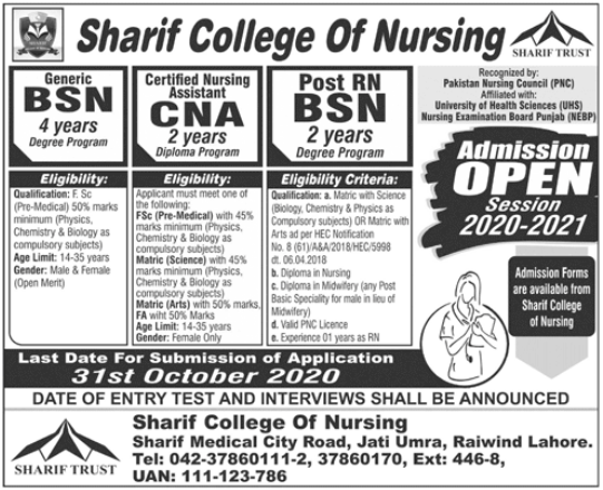 Sharif College Nursing, Sharif Trust invites applications for admissions 2020 fo Bachelor of Science Nursing BSN, Post RN BSN Nursing, CNA Certified Nursing Assistant in Lahore.