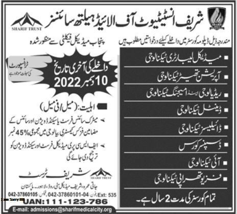 Sharif Institute of Allied Health Sciences Admission open