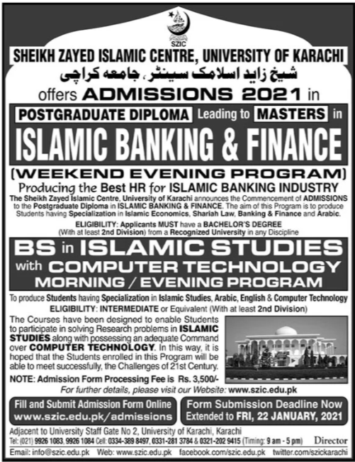 Sheikh Zayed Islamic Center is seeking applications for admissions 2021 in Postgraduate Diploma in Islamic Banking and Finance, BS in Islamic Studies, Masters in Islamic Banking and Fiance in Karachi. Sheikh Zayed Islamic Center is affiliated with Karachi University.