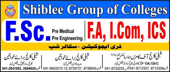 Shiblee Group of Colleges Faisalabad announced admission in F.Sc(Pre Medical, Pre Engineering), FA, ICS, I.Com. Free Education & Scholarships.