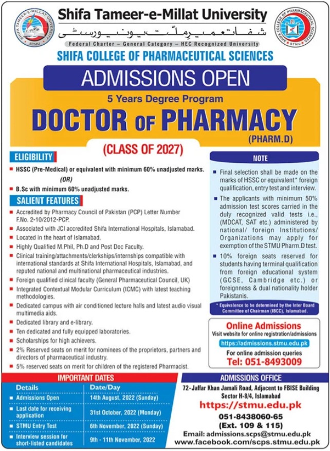 Shifa Tameer e Milat University Islamabad Doctor of Pharmacy Admission 2022 open in Doctor of Pharmacy Pharm-D 5 Years Degree Program. Eligibility Criteria is Faculty of Science in Pre-Medical or equivalent with minimum 60% unadjusted marks or Bachelor of Science with minimum 60% unadjusted marks can apply for admission. Last date of apply 31st October, 2022. Visit website for online registration and admission.