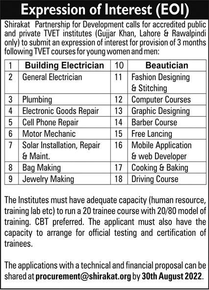 Shirakat Partnership for Development calls for accredited public and private TVET institutes including cities of Gujjar Khan, Lahore and Rawalpindi to submit an expression of interest for provision of 3 month TVET Courses for young women and men. Shirakat Courses Admissions 2022 are announced in Building Electrician, General Electrician, Plumbing, Electronic Goods Repair, Cell Phone Repair, Solar Installation, Repair and Maint, Bag Making, Jewelry Making, Fashion Designing and Stitching, Beautician, Computer Courses, Graphic Designing, Barber Course, Free Lancing, Mobile Application and Web Developer, Cooking and Baking, Driving Course. Last date to apply is August 30, 2022. Shirakat TVET Courses Admissions 2022 are open now.
