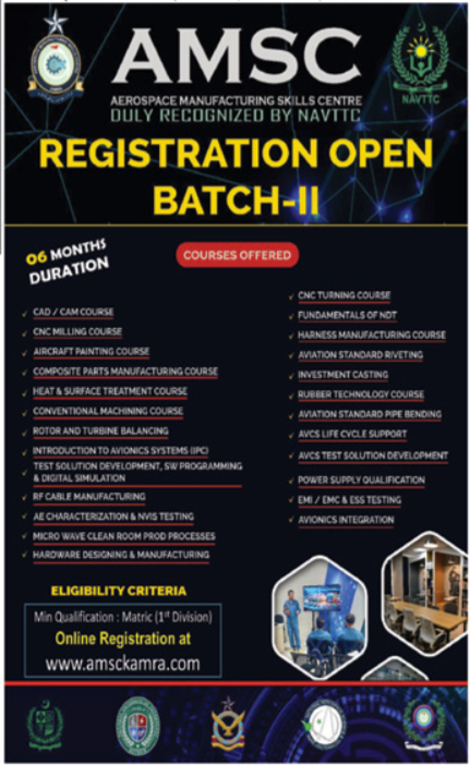 The Aerospace Manufacturing Skills Centre, a premier institution duly recognized by NAVTTC, has officially announced the opening of registrations for its highly anticipated Batch-II. As the aviation and manufacturing sectors continue to expand, AMSC is playing a pivotal role in equipping the workforce with specialized technical skills required for high-precision industries.