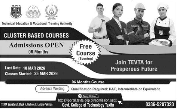 The Technical Education & Vocational Training Authority has officially opened its doors for the 2026 academic session, offering specialized technical training designed to bridge the skills gap in the industrial sector. As part of its mission to provide a prosperous future through quality vocational training, TEVTA is inviting applications for its highly sought-after cluster-based courses at the Govt. College of Technology Taxila.