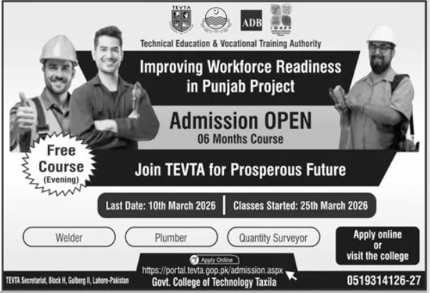 The Technical Education & Vocational Training Authority has officially opened its latest enrollment cycle under the high-impact "Improving Workforce Readiness in Punjab Project." This initiative aims to bridge the skill gap in the local industry by providing specialized technical training to the youth. TEVTA Admissions 2026 represent a strategic opportunity for individuals to gain employment-ready skills through government-backed certifications.