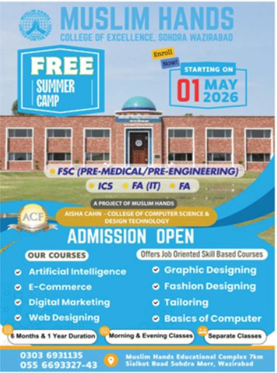 The Muslim Hands College of Excellence, Sohdra Wazirabad has officially announced its intake for the upcoming academic session, offering a unique blend of traditional intermediate education and modern technical training. As a flagship project of Muslim Hands, the institution continues its mission of providing quality education and market-relevant skills to the youth of the region. The MHCE Admissions 2026 cycle is now open, inviting students to enroll in programs designed for both academic progression and immediate career readiness.