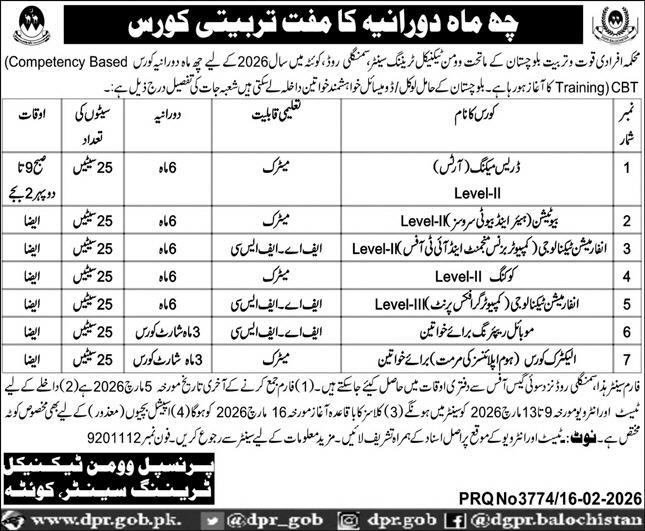 The Women Technical Training Center, Quetta, operating under the Department of Manpower and Training Balochistan, has officially announced its latest intake for the year 2026. This initiative offers Competency Based Training CBT to local and domiciled women of Balochistan, focusing on high-demand technical skills. As the admissions 2026 cycle begins, the institution aims to empower the female workforce through specialized, free-of-cost six-month training programs.