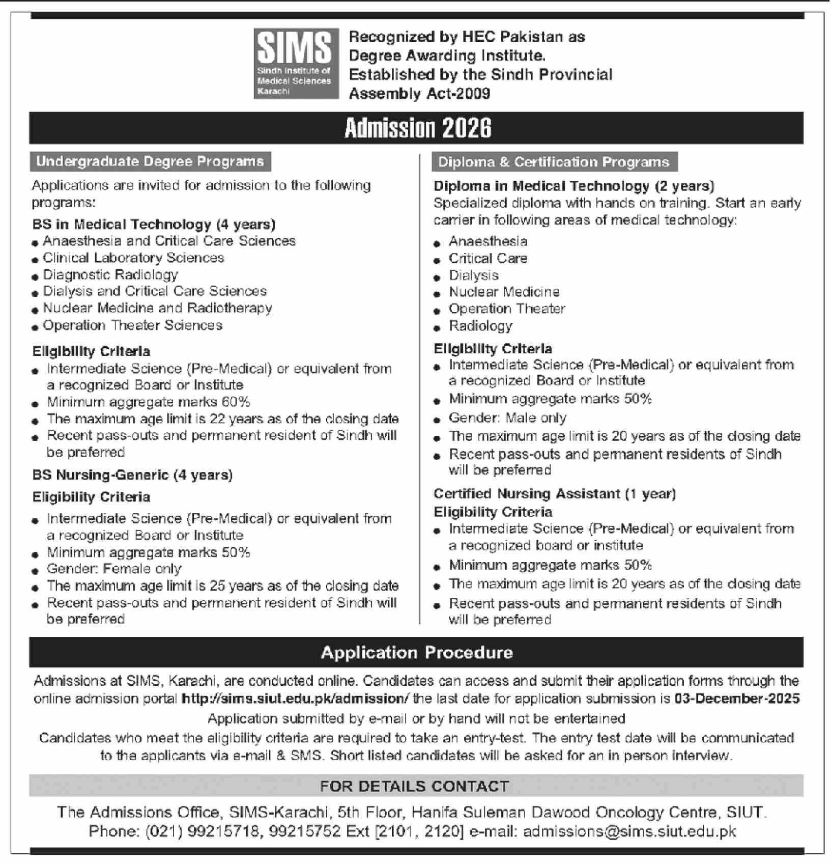 The Sindh Institute of Medical Sciences SIMS Karachi, is a HEC-recognized Degree Awarding Institute established under the Sindh Provincial Assembly Act-2009. SIMS offers a range of undergraduate, diploma, and certification programs designed to train competent professionals in medical and healthcare fields, catering to the growing needs of the healthcare sector in Pakistan.