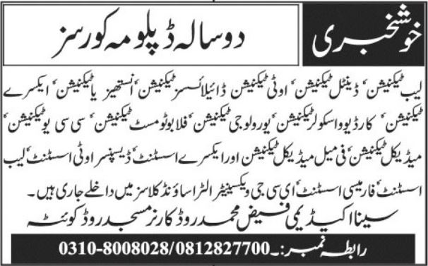 Sina Academy Quetta has offered admission for DAE in Lab technician, OT technician, Dialysis technician, Anesthesia technician, Dental technician, X-Ray technician, Cardiovascular technician, Urology technician, Pharmacy technician.