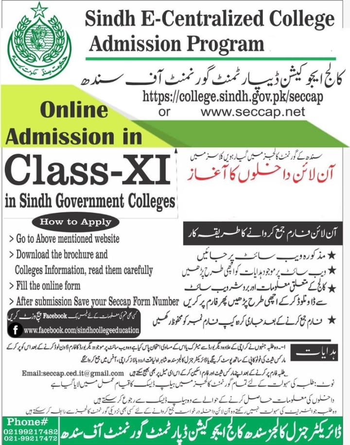 Karachi, Government of Sindh, College Education Department has announced the online admission process in the inter part 1 classes and the candidates can submit their online admission forms. The candidates will follow their Sindh E-Centralized College Admission Program 11th Class Online Admission and the candidates visit the mentioned website and read the instructions there carefully. They can download the information about the collection and read them and fill the online form and submit it within given schedule.