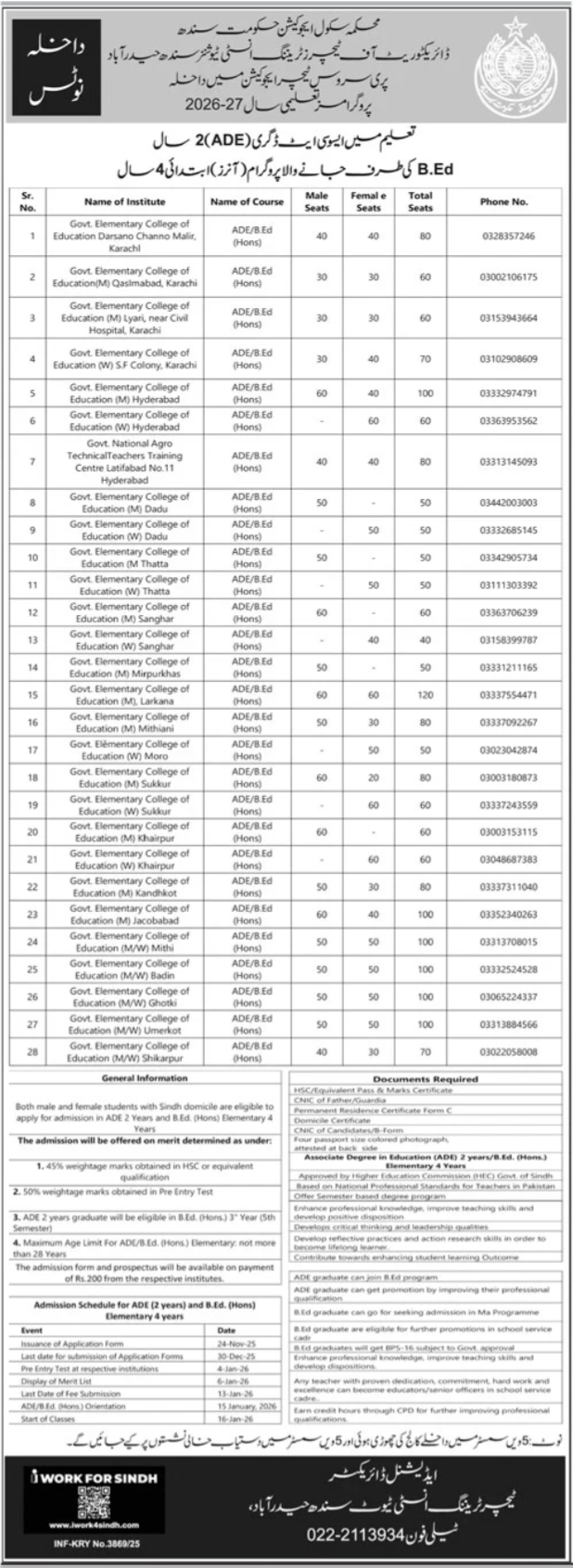 The Directorate of Pre-Service Teacher Education, School Education & Literacy Department, Government of Sindh, Hyderabad, is pleased to announce the commencement of admissions 2025-26 for the Associate Degree in Education ADE 2-Year Program and the B.Ed. Hons. Elementary 4-Year Program. tent, skilled, and knowledgeable teachers for elementary education across Sindh. Both programs are designed to prepare professionally competent, skilled, and knowledgeable teachers for elementary education across Sindh.