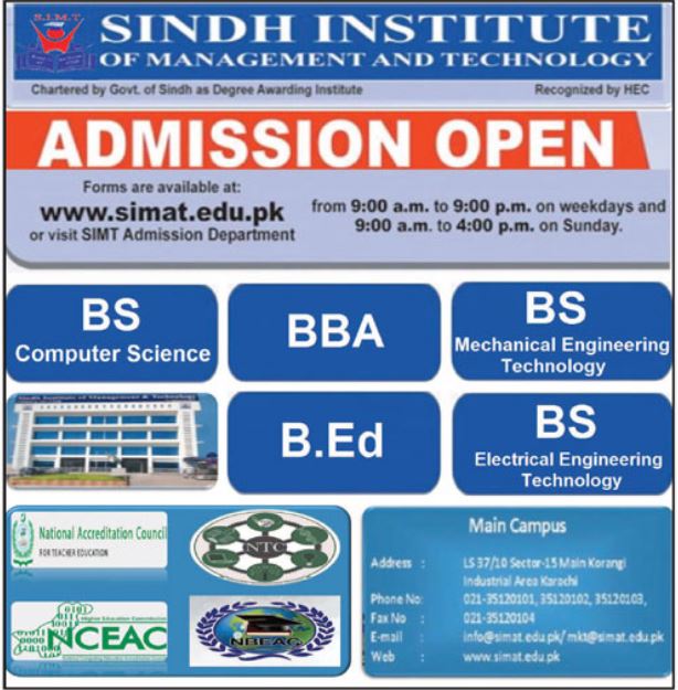 Sindh Institute of Management & Technology BS admission 2019