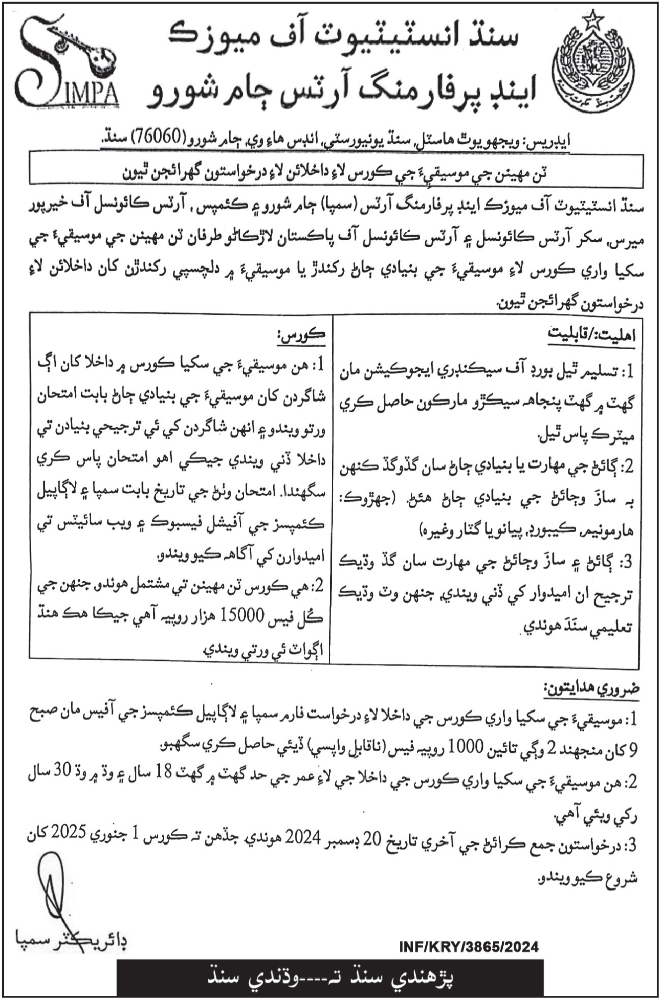 Complete information regarding these programs in Sindh Institute of Music & Performing Arts Jamshoro Admissions 2025 is available in the below given advertisement. This advertisement contains all the important details about the admission process, eligibility criteria, and other necessary instructions for candidates. Interested applicants are encouraged to carefully read the advertisement to ensure they meet the requirements and follow the correct procedure for applying. The institute is dedicated to fostering artistic excellence and nurturing the talents of future musicians, offering a comprehensive curriculum in music and performing arts.