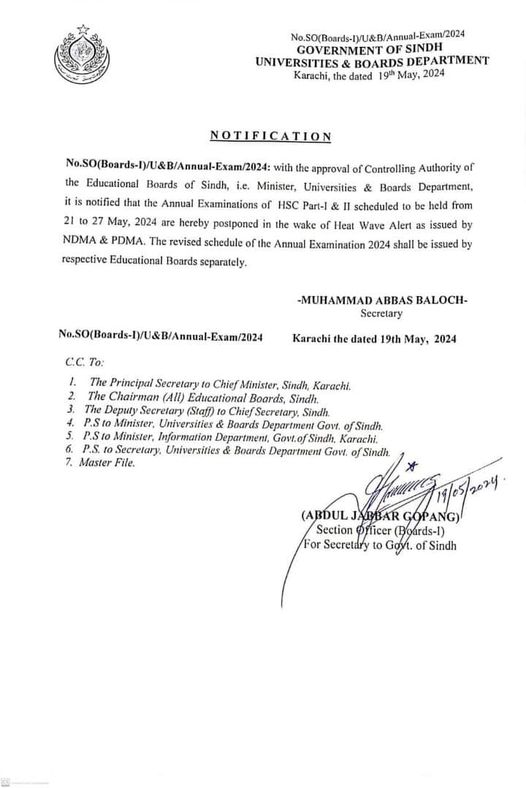 The Sindh government has decided to postpone intermediate exams across the province by five days due to the prevailing heatwave conditions. This decision comes after a proposal by provincial Minister for Universities and Boards Muhammad Ali Malkani was endorsed by Sindh Chief Minister Murad Ali Shah. The students can check the fresh information of Sindh Inter Exams Delayed Due to Heatwave.