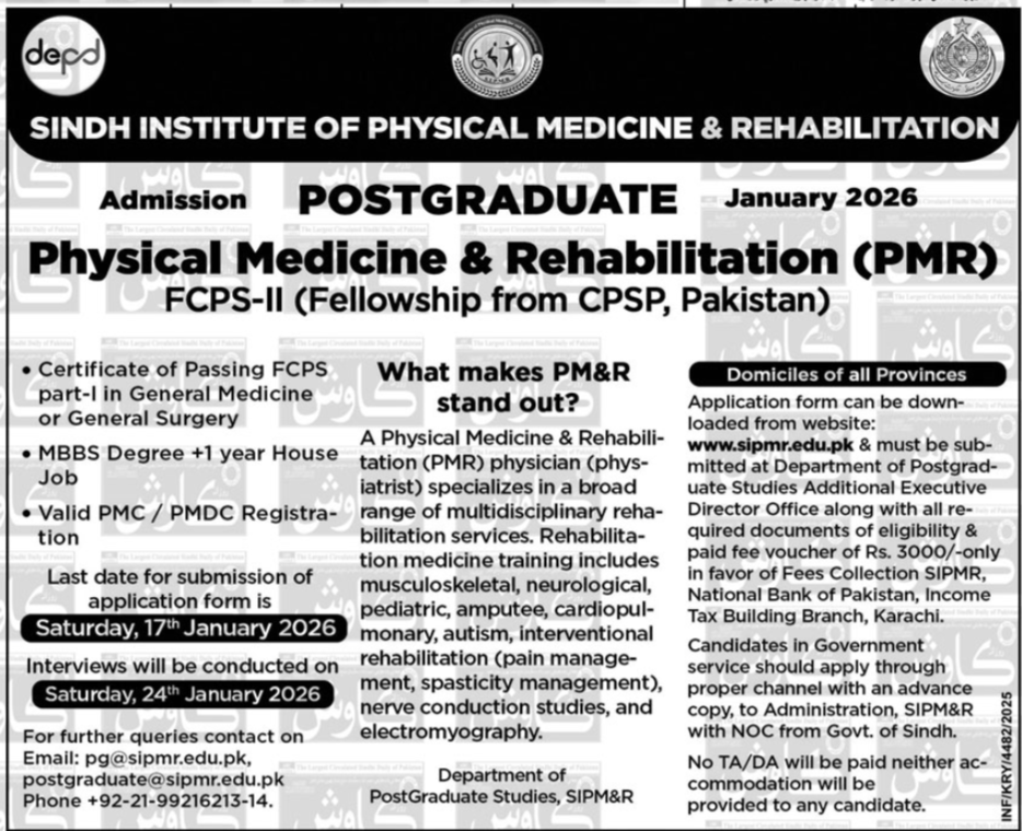 The Sindh Institute of Physical Medicine & Rehabilitation SIPM&R is now accepting applications for its Postgraduate Program in Physical Medicine & Rehabilitation PMR FCPS-II starting January 2026. This fellowship, accredited by the College of Physicians & Surgeons Pakistan CPSP, offers specialized training in rehabilitation medicine for qualified medical professionals.