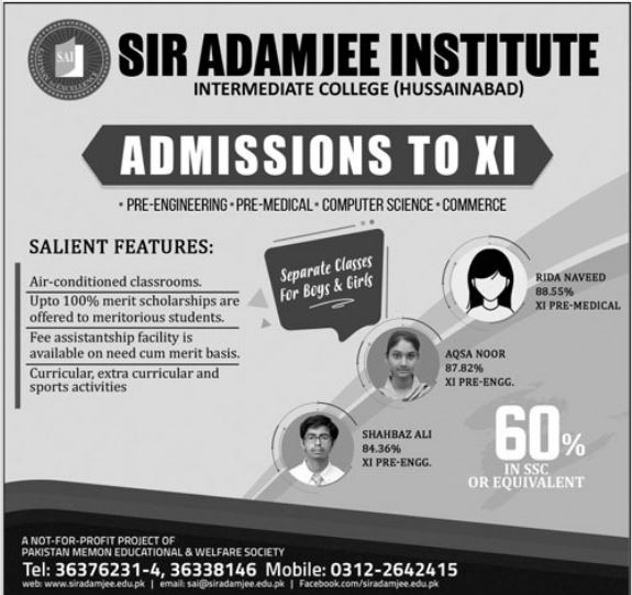 Sir Adamjee Institute opens admission for First year in Pre Engineering, Pre Medical, Computer science, commerce.
