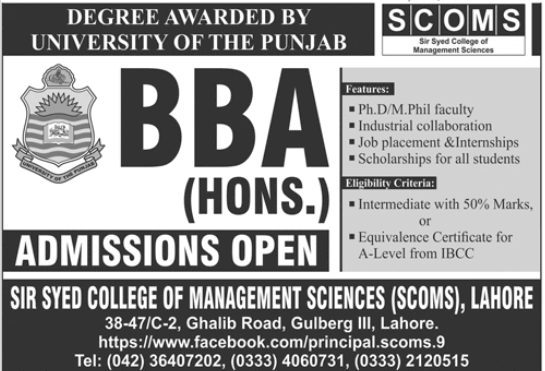 Sir Syed College of Management Sciences SCOMS is seeking applications for admissions 2020 in BBA Hons in Lahore, Pakistan 2020. BBA Admissions 2020 in Lahore.
