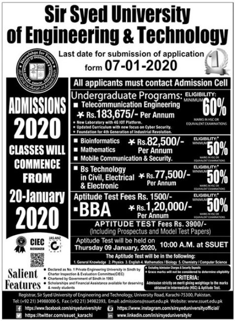 Sir Syed University of Engineering & Technology Karachi has offering admissions for BS in Telecommunication Technology, Bioinformatics, Mathematics, Civil Technology, Electrical & Electronic Technology, BBA. Classes will commence from 20 Jan 2020.