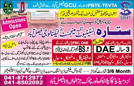 Sitara Institute of Management & Technology Faisalabad has open admission for BS in Engineering Technology Program, 3 Year DAE in Electrical, Electronics, Mechanical, Civil, Chemical, Computer Information Technology. Scholarships are available.