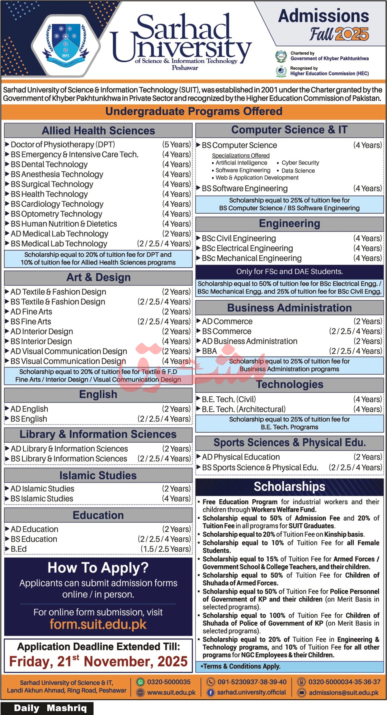 Sarhad University of Science & Information Technology SUIT was established in 2001 under the charter granted by the Government of Khyber Pakhtunkhwa as a private-sector university. Recognized by the Higher Education Commission of Pakistan, SUIT has grown into a leading institution offering a wide array of undergraduate and diploma programs across multiple disciplines.