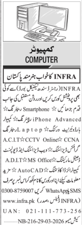 The Institute of National Frontier and Resource Advancement has announced its latest technical training session for 2026 providing a path toward professional success and financial independence. Registered with the Sindh Technical Board INFRA is offering specialized programs designed to equip students with modern technical skills. For those looking to excel in the digital landscape securing a spot in the INFRA admissions 2026 is an essential move for career growth.