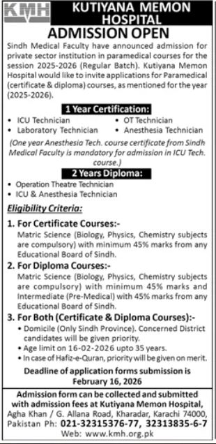 Sindh Medical Faculty, Karachi SMF has officially announced SMF Admissions 2026 for private sector institutions in paramedical courses for the 2025-2026 Regular Batch session. Under this Admission 2026 drive, Kutiyana Memon Hospital KMH is now accepting applications for multiple paramedical certificate and diploma programs, offering students a strong pathway into the healthcare field with practical, job-ready skills.
