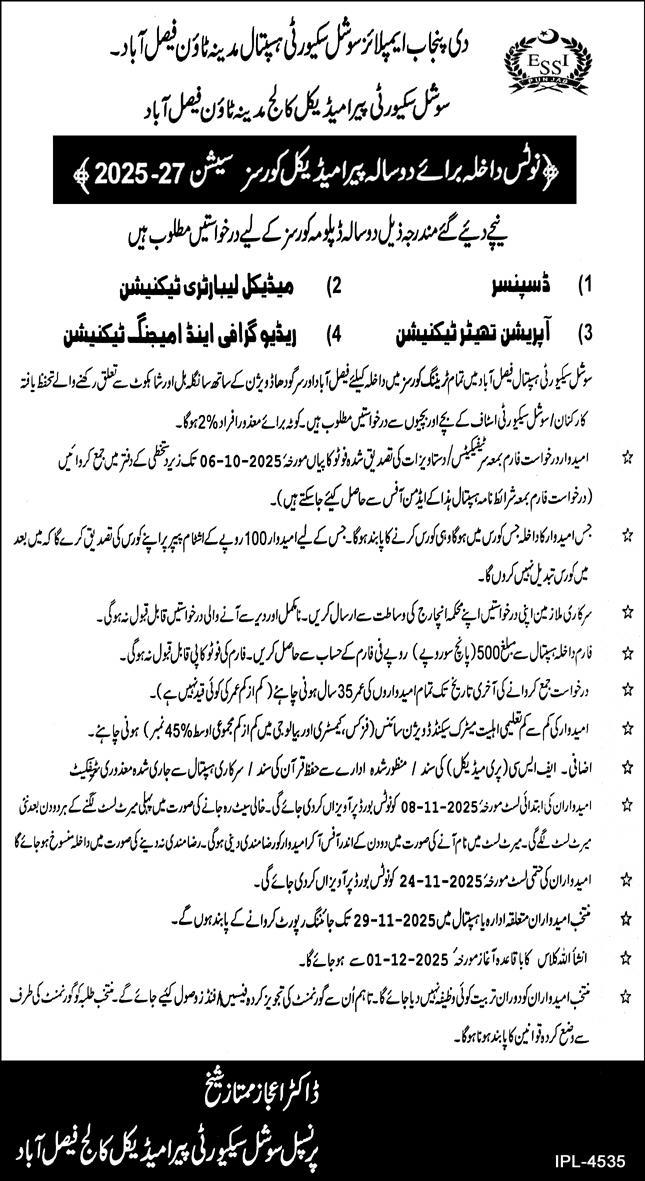 Social Security Paramedical College, located at Punjab Employees Social Security Hospital, Madina Town, Faisalabad, invites applications for admission 2025 to the following 2-year diploma programs.