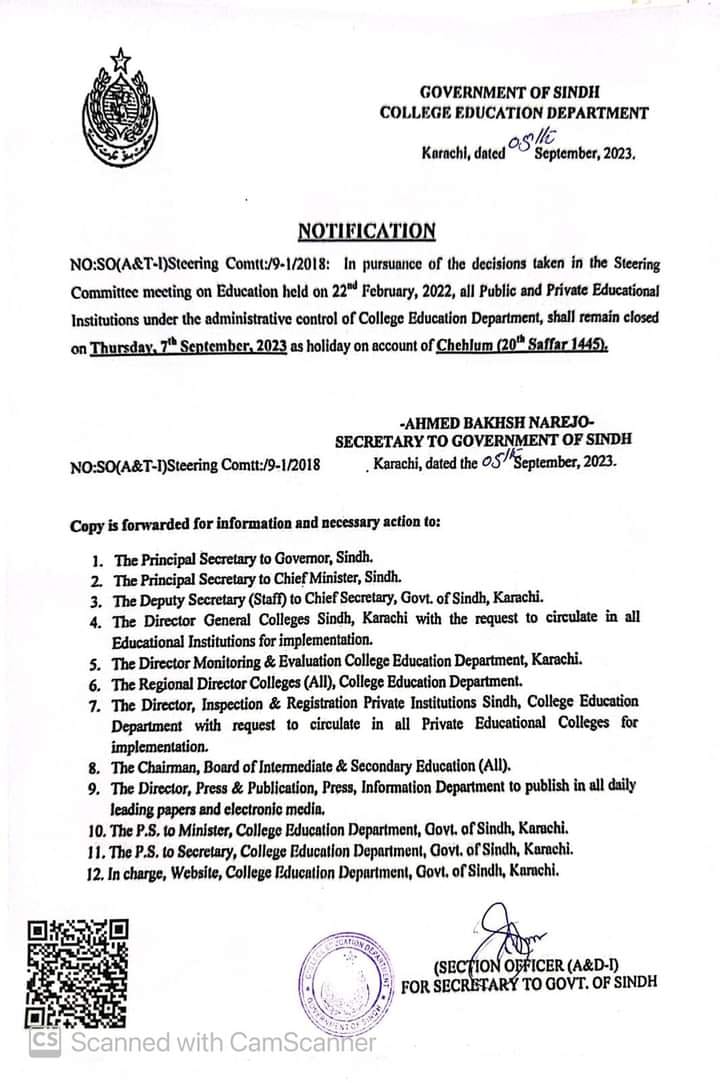 Sindhs interim government has declared a holiday on September 7th for all public and private schools and colleges to observe the Chehlum of Hazrat Imam Hussain RA. This significant day, observed 40 days after Ashura, pays tribute to Hazrat Imam Hussain RA and his 72 companions, who made ultimate sacrifices during the Battle of Karbala in 61 AH. The decision was confirmed by the Sindh Education Department in alignment with the steering committees verdict. Citizens can anticipate mourning processions in various cities and towns as they gather to honor the martyrs of Karbala. The students can get latest updates of Special Holidays in Sindh Commemorate Religious Significance.