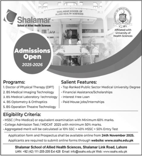 Shalamar School of Allied Health Sciences, affiliated with the University of Health Sciences UHS, Lahore, invites applications for admissions in the academic year 2025-2026. The school offers specialized programs in allied health sciences designed to prepare students for professional careers in the medical field.