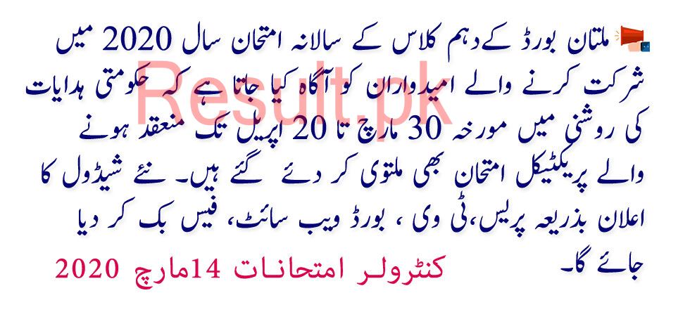 All Board of Intermediate & Secondary Education BISE in Punjab like BISE Lahore, BISE Grw, BISERWP, BISE DG Khan, BISE Sahiwal, BISE Multan, BISE BWP, BISE Sargodha and BISE FSD have cancelled the Matric Calss 10th Practical Exams 2020 on the order given by the government of Punjab for prevention and protection of COVID-19 threat. All candidates are informed that the SSC Part II Practical Exams 2020 will be schedule later. The new 10th Class Practical Date Sheet 2020 will be issued. Moreover, for precautionary measures and to avoid from Corona Virus be careful and keep visiting Result.PK for latest updates regarding educational news and corona virus live updates Pakistan.