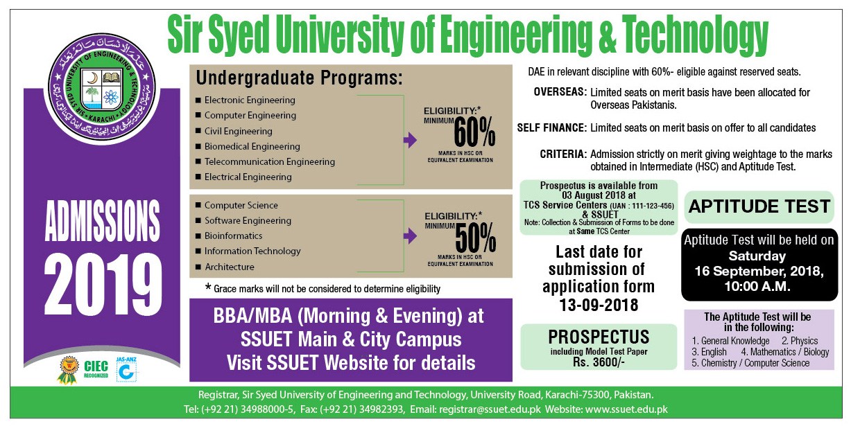 Karachi, Sir Syed University of Engineering & Technology Karachi has announced the admission process in the undergraduate programs and in the BBA / MBA in the morning and evening shifts at the main and city campus. The candidates can send their admission forms till the final date of 13 September and the entry test of the eligible candidates will be held on 16 September 2018. The candidates will get their admission forms, prospectus and the model papers for Rs.3600/-. The candidates can get the detailed information to fill in the admission forms and submit them to the admission office of SSUET Karachi.