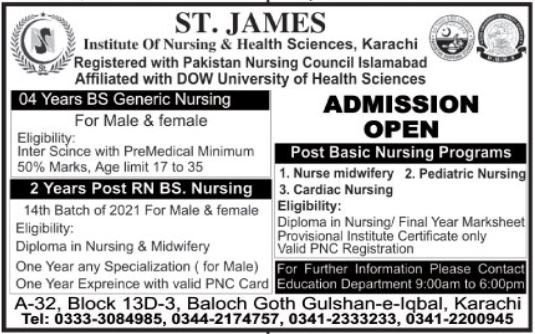 ST. James Institute of Nursing and Health Sciences invites applications for admissions 2021 in 4 years BS Generic Nursing, Post Basic Nursing Program, Post RN BS Nursing in Karachi.