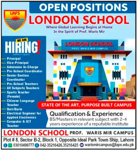The London School LAPS, renowned for its commitment to academic excellence and holistic education, invites passionate, qualified, and dedicated professionals to become part of its growing team at the Prof. Waris Mir Campus, Lahore.