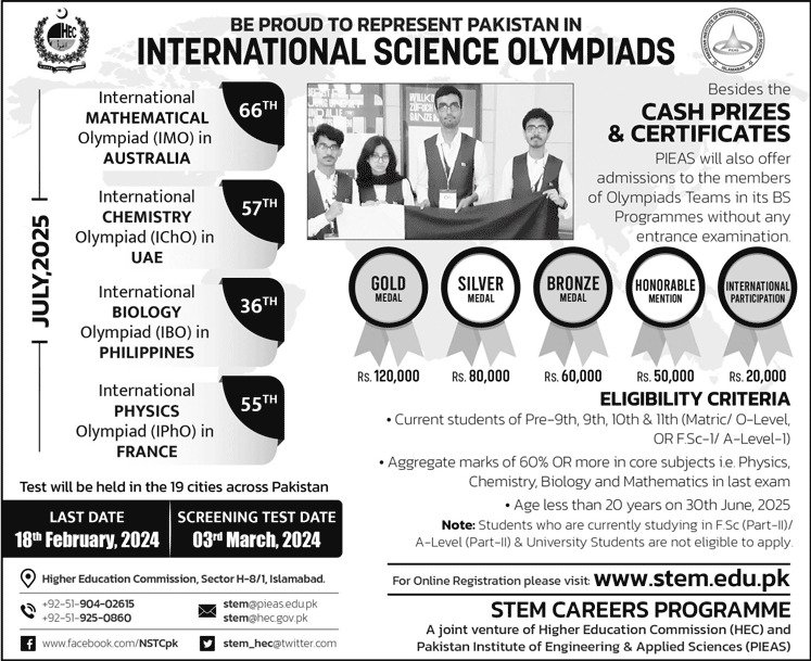 The STEM Careers Program is thrilled to unveil the registration schedule for the upcoming 20th National Science Talent Contest NTSC. Successful contenders will have the unique opportunity to represent Pakistan on the international stage, participating in prestigious science competitions worldwide. These include the International Biology Olympiad in the Philippines, the International Mathematics Olympiad in Australia, the International Physics Olympiad in France, and the International Chemistry Olympiad in the UAE. The candidates can get the detailed information regarding STEM Career Program Registration Schedule International Science Olympiad.
