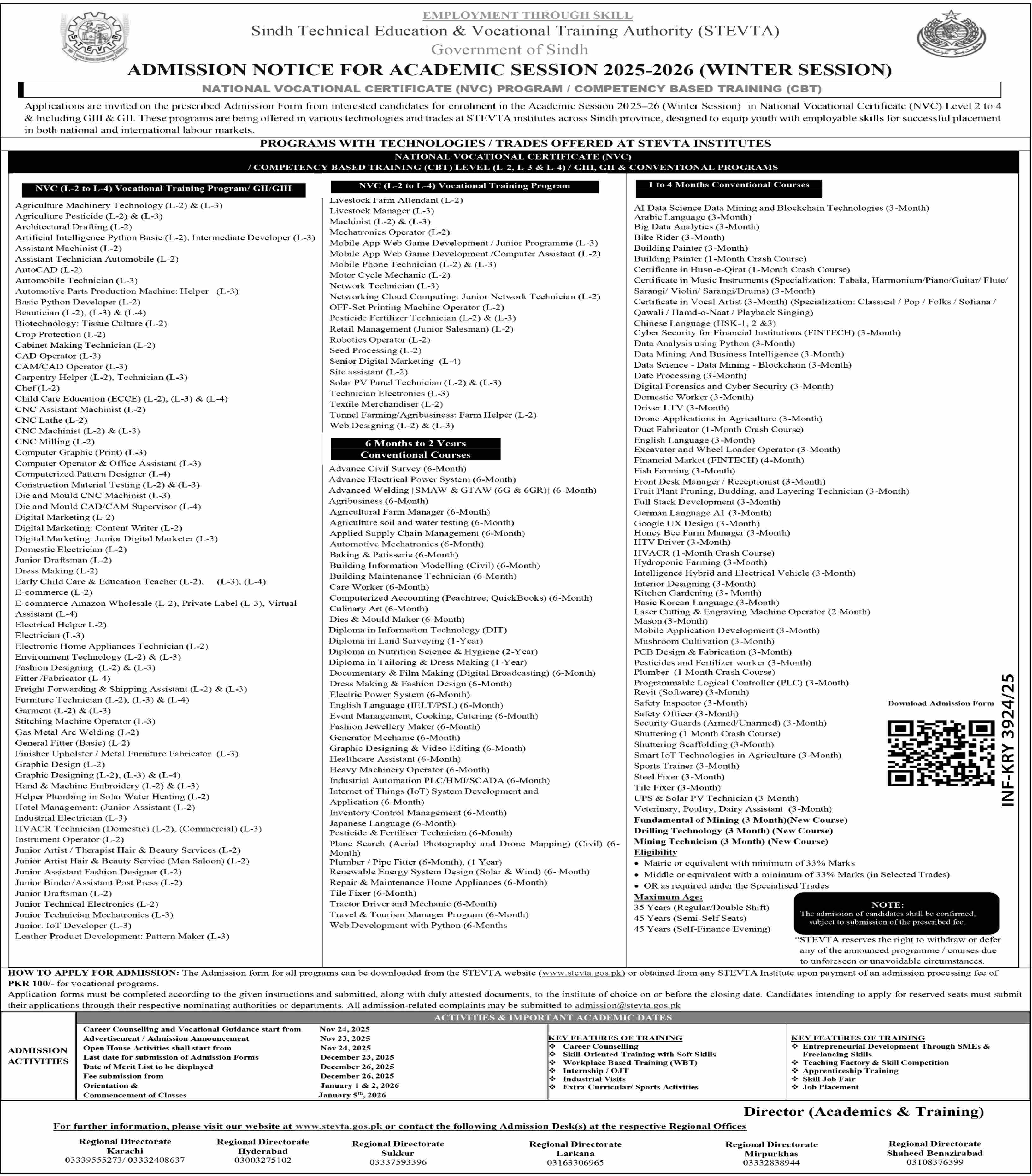 STEVTA invites applications from interested candidates for admission to the National Vocational Certificate NVC Level 2 to 4, Competency-Based Training CBT programs, G-III & G-II, and Conventional Courses across various institutes in Sindh. These programs are designed to equip the youth with modern, employable skills for careers in national and international job markets.