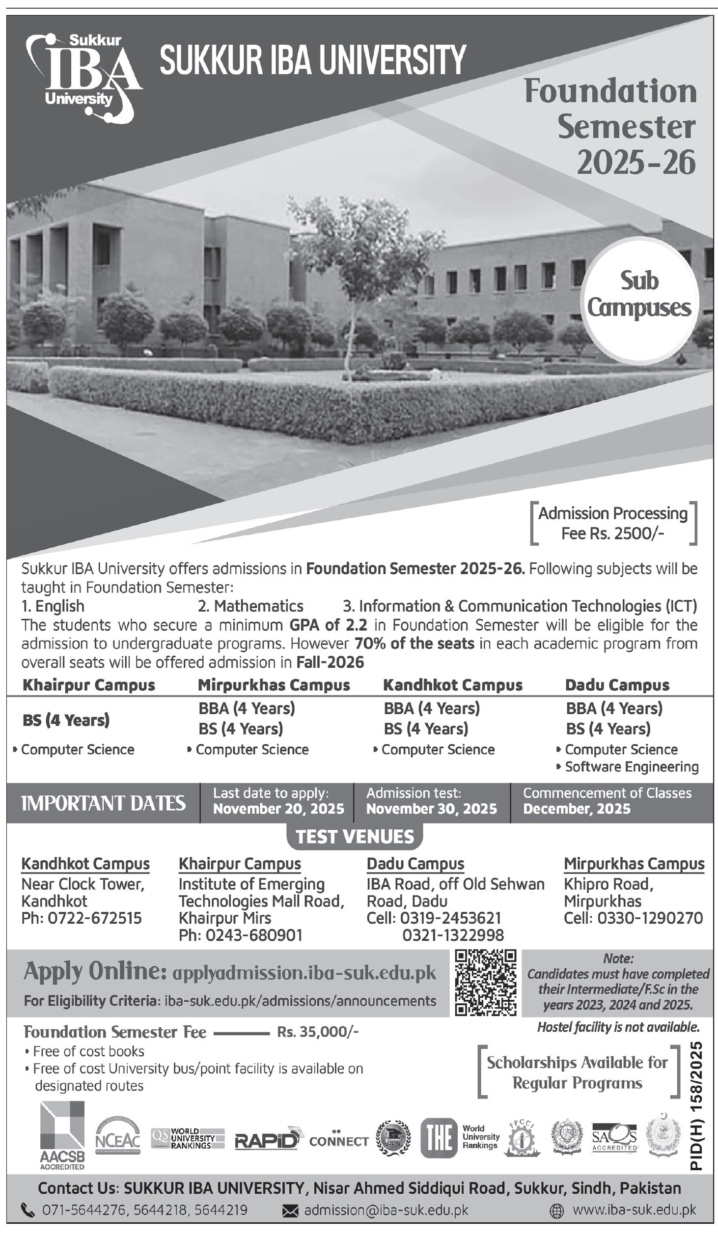 Sukkur IBA University invites applications for its Foundation Semester 2025-26 across its main campus in Sukkur and sub-campuses in Khairpur, Kandhkot, Mirpurkhas, and Dadu. The Foundation Semester provides a pathway for students to qualify for undergraduate programs at the university.