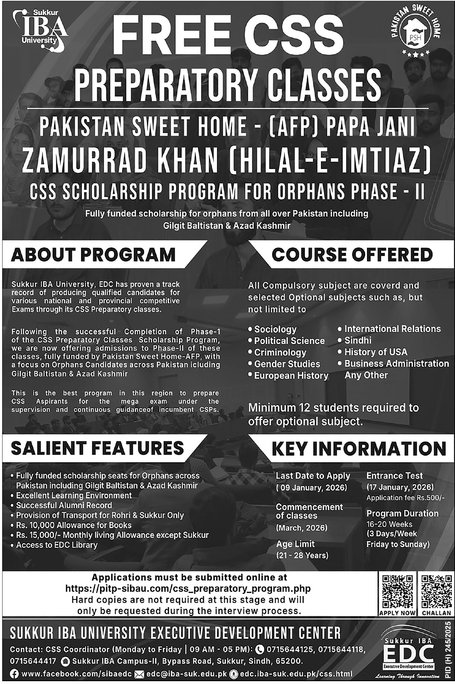 Sukkur IBA University, through its Executive Development Center EDC, is proud to announce Phase-II of its CSS Preparatory Classes Scholarship Program. Following the successful completion of Phase-I, this fully funded initiative is offered in collaboration with Pakistan Sweet Home AFP – Papa Jani Zamurrad Khan Hilal-e-Imtiaz, aimed at supporting orphan candidates from across Pakistan, including Gilgit Baltistan and Azad Kashmir.