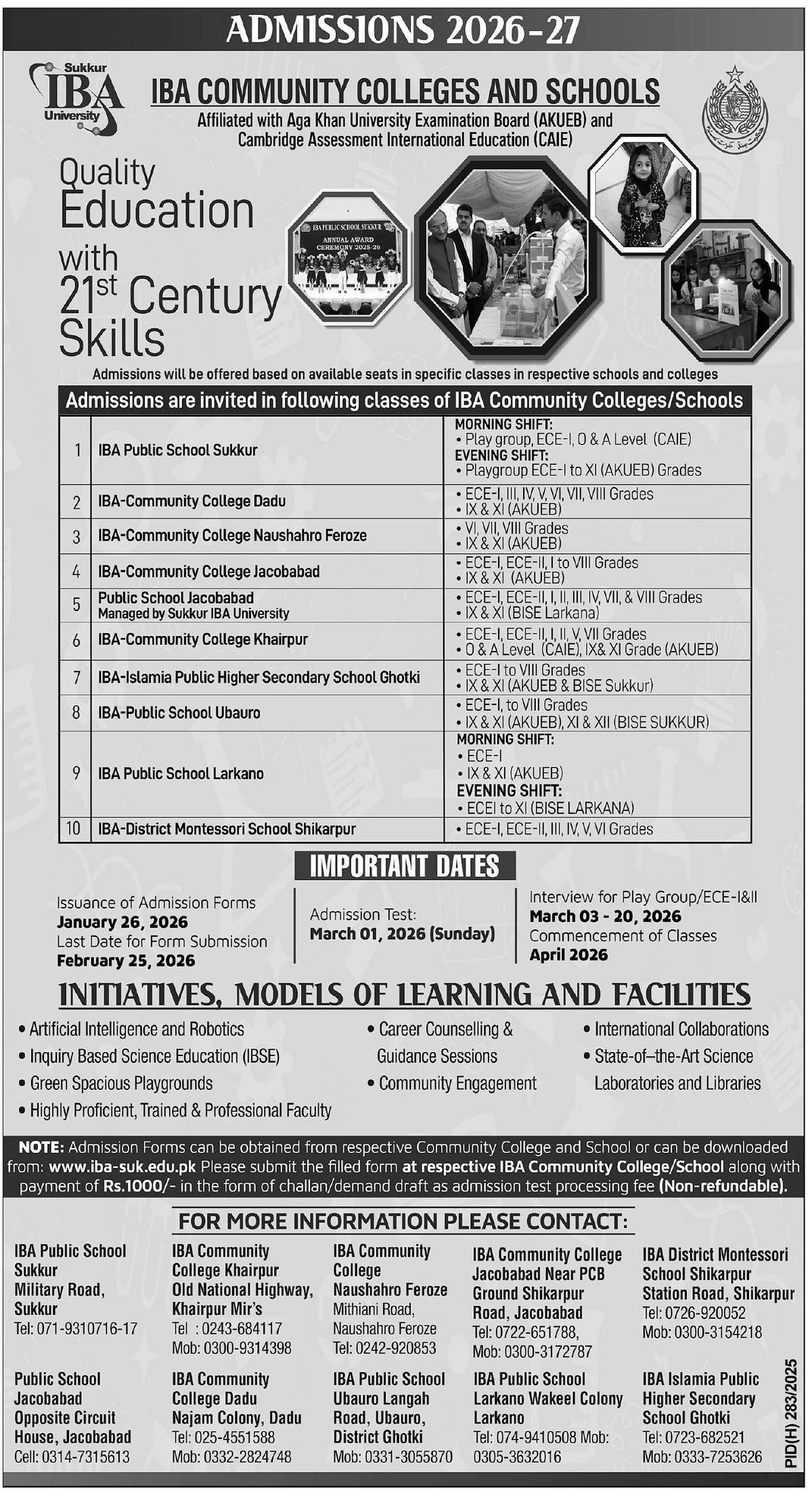 Sukkur IBA Admissions 2026: Community Colleges and Schools Open