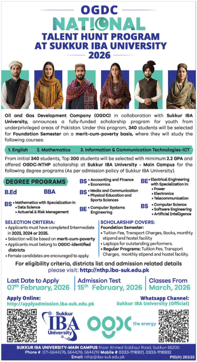 The Oil & Gas Development Company OGDC, in collaboration with Sukkur IBA University, has announced the OGDC NTHP Admissions 2026. This initiative is designed to empower students from disadvantaged regions by providing them with access to top-tier higher education through a merit-cum-need-based scholarship.