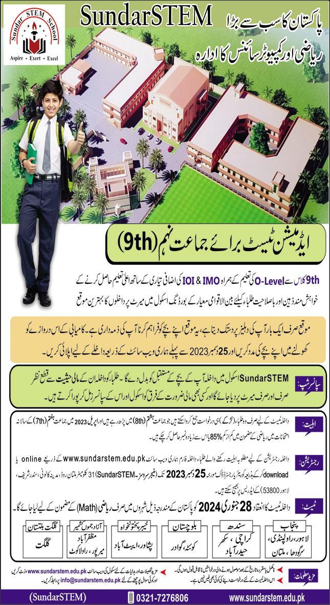 Sundar STEM School Class 9th Lahore Admission 2023