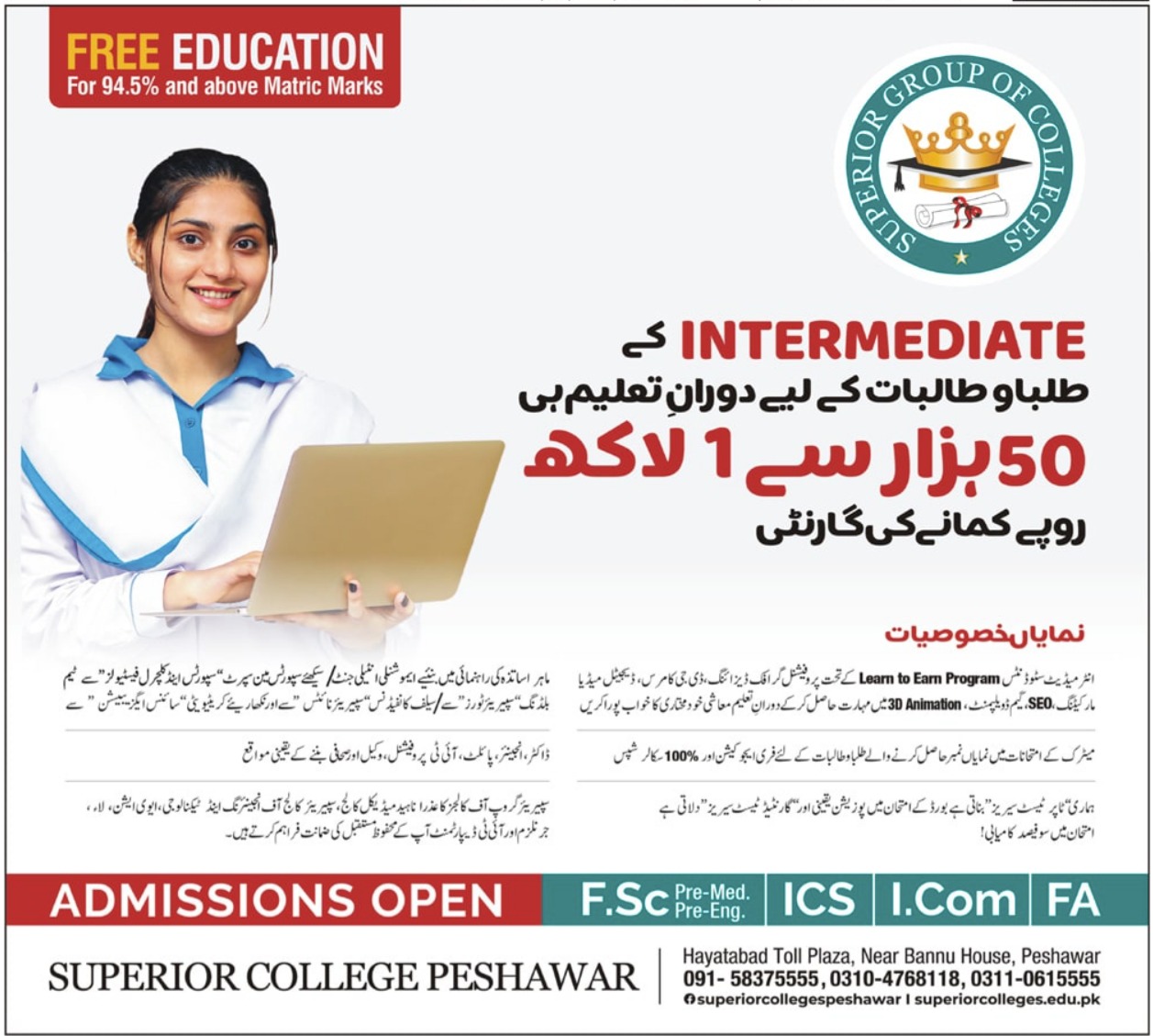 Peshawar, September 12, 2023 – The Superior Group of Colleges, located near Bannu House at Hayyatabad Toll Plaza, Peshawar, is opening its doors for the Fall 2023 admissions season, providing an exceptional opportunity for aspiring students.