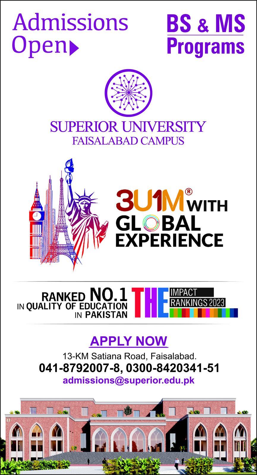 The admissions are open for both Bachelors BS and Masters MS programs, offering a diverse range of courses to cater to the evolving needs of students. This move is in line with Superior Universitys commitment to providing quality education and fostering academic excellence.