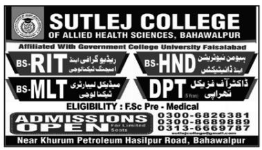 Sutlej College of Allied Health Sciences invites applications for admissions 2021 in BS Radiography and Imaging Technology, BS RIT, BS HND, BS Human Nutrition and Dietetics, BS Medical Laboratory Technology, BS MLT, Doctor of Physical Therapy, DPT in Bahawalpur, Punjab.