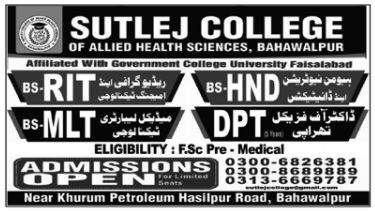Sutlej College of Allied Health Sciences Bahawalpur has announced admissions for BS in Radiology and Imaging Technology, Medical Laboratory Technology, Human Nutrition and Dietetics, DPT Doctor of Physical Therapy. Scholarships are available. Admissions are open.