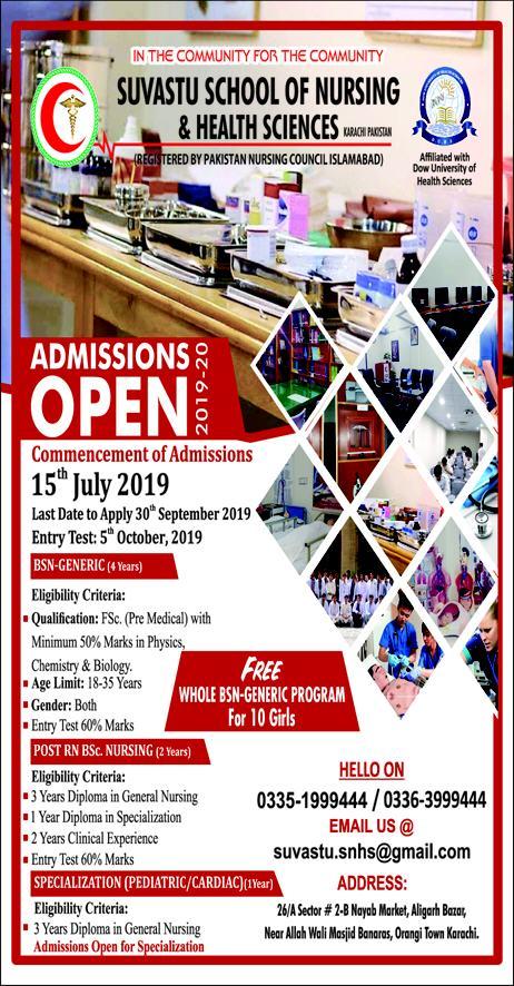 SUVASTU School of Nursing & Health Sciences opens admission in BSN-GENERIC 4 Years, Post RN BS.c Nursing 2 year, Specialization(Pediatric/Cardiac) 1 year.
