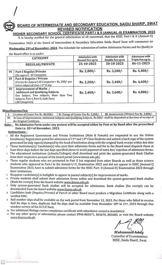 Swat Board Inter 2nd Annual Revised Schedule 2023