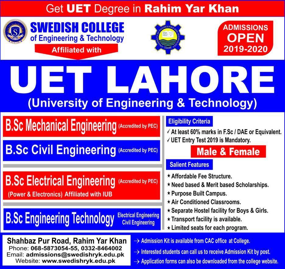 Swedish College of Engineering & Technology Rahim Yar Khan has announced admissions for BSc in Engineering Technology, Civil Engineering, Electrical Engineering, Mechanical Engineering. Scholarships are available.