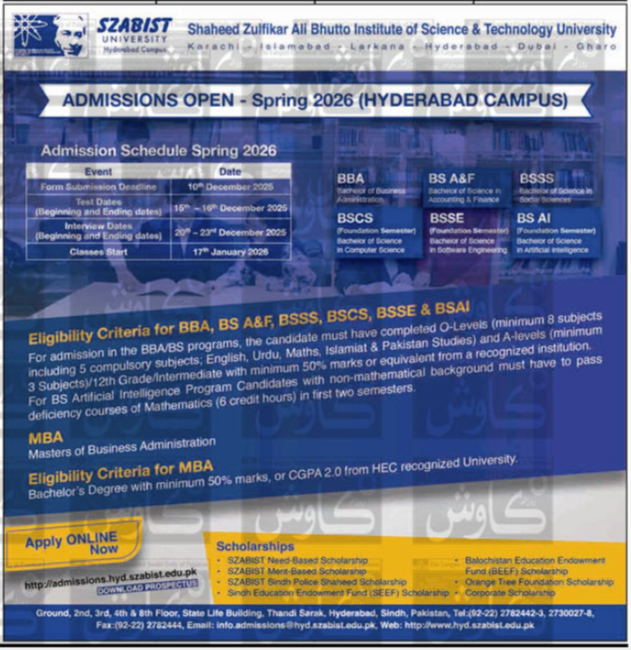 Shaheed Zulfikar Ali Bhutto Institute of Science & Technology SZABIST, a leading university with campuses in Karachi, Islamabad, Larkana, Hyderabad, Dubai, and Gharo, has announced that admissions are now open for Spring 2026 at its Hyderabad Campus. Prospective students are encouraged to apply online and take advantage of the diverse academic programs and scholarship opportunities available.