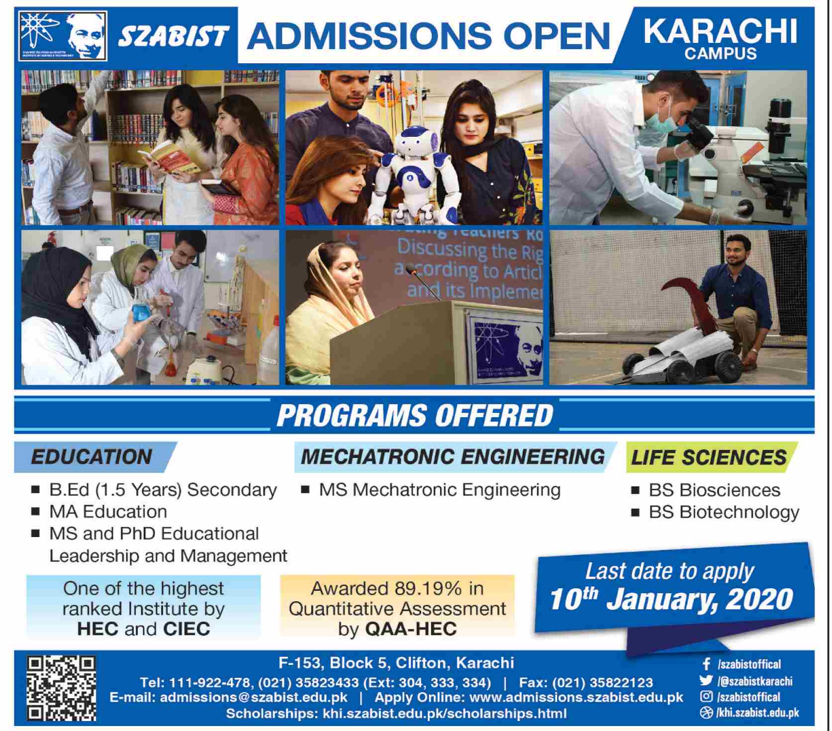 Shaheed Zulfiqar Ali Bhutto Institute of Science & Technology Karachi Campus announced the Admission for the session of 2020. The Shaheed Zulfiqar Ali Bhutto Institute of Science & Technology Karachi Campus has now starts the Admission in the B.Ed, MA